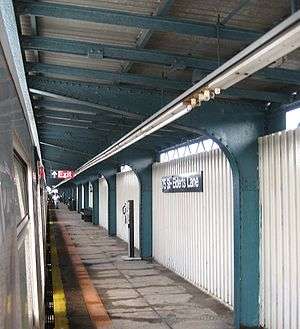 This elevated station opened on May 28, 1917,[1] and has two side platforms and two tracks with space for a center track. The station is centered between Eldert Lane and 75th Street. The eastern end (railroad north) end of the station is just east of 75th Street is in Queens while the western end (railroad south) lies over the west side of Eldert Lane. Since this portion of Eldert Lane lies on the border between Brooklyn and Queens, most of the station is in Queens, with a small portion of it in Cypress Hills, Brooklyn. The MTA counts the station as being in Queens. The New York City GIS portal labels the station as "75th St–Eldert Ln", with the "s" removed from "Elderts," matching the current name of the street. (The street name has evolved from Eldert's Lane to Elderts Lane to the current Eldert Lane, which gives rise to the discrepancy between the MTA naming and the street name.) [2][3][4]