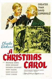 Made by Metro-Goldwyn-Mayer, and originally intended to star Lionel Barrymore (who played the role of Scrooge annually on radio but was forced to drop out of the film because of his arthritis, though he narrated its trailer),[2] the movie starred Reginald Owen as Scrooge and the married couple Gene and Kathleen Lockhart as the Cratchits. Terry Kilburn, better known for his portrayal of Colley in Goodbye, Mr. Chips, costarred as Tiny Tim and a young June Lockhart (Gene and Kathleen's daughter) made her screen debut as one of the Cratchit daughters.[3] Leo G. Carroll played Marley's Ghost. The characters of Fred (Scrooge's nephew) and Elizabeth, his fianceé (his wife in the novelette), were greatly expanded in order to work in a romantic angle to the story that Dickens did not intend. The couple was played by Barry MacKay and Lynne Carver. Ann Rutherford, better known as Polly Benedict in the Andy Hardy films and as Carreen O'Hara in Gone with the Wind, was a young and attractive Ghost of Christmas Past, rather than the somewhat unusual creation that Dickens described.