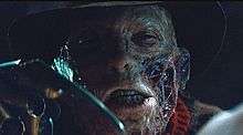 Discussing his physical appearance, Form and Fuller explained that Freddy would be more similar to a real burn victim.[13] Form later clarified that there was a fine line they did not want to cross when it came to making Freddy look like a true burn victim. According to the producer, the crew had many reference photos of actual victims, which detailed how white the skin would appear after healing. Form did not want the audience to turn away in disgust every time Freddy was on the screen, so they opted to hold back on some of the realism. Fuller noted how horrific the images were, and how difficult they were to look at.[25] The special effects crew that worked on The Dark Knight, creating the computer-generated images (CGI) for Two-Face's face, were brought in to work on the minimal CGI used for Freddy's face. The CGI is used in conjunction with the special effects make-up that Haley wears.[14] The prosthetics used to create Freddy's physical look were designed by Andrew Clement. Haley described the experience of wearing all of the prosthetics and make-up as "pretty encumbering".[26]