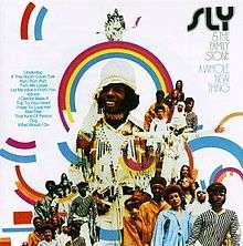 ![]() 1970 reissue cover for A Whole New Thing. Note the use of photographs similar to those on the cover of the Sly & the Family Stone Greatest Hits album, and the inclusion of Rose Stone as a member of the Family Stone. Rose Stone was not a member of the band at the time of this LP. |