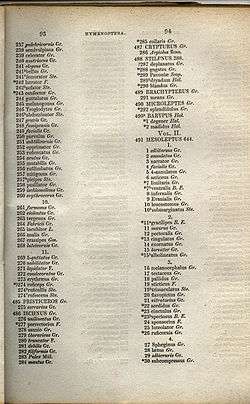 Six pages of introductory matter are followed by 282 columns of insect names in two columns per page systematically arranged and followed by an index to genera. This work attributed to John Curtis was in fact co-authored by James Charles Dale, Francis Walker and Alexander Henry Haliday; Haliday and Walker writing almost the whole of the sections on Diptera and parasitic Hymenoptera. The list contains 1500 generic and 15,000 specific names. Ireland and Britain are not separated.