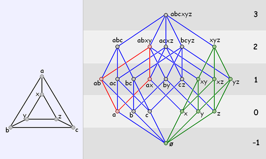Smaller posets, and polytopes in particular, are often best visualised by using a Hasse diagram, as shown. By convention, faces of the equal rank are placed on the same vertical level. Each "line" between faces indicates a pair F, G such that F < G where F is below G in the diagram.