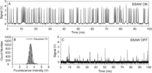 Fig. 11A shows a typical data record of the fluorescent peaks using calibration beads.[20] The uniform peak intensities in the data plot indicate a consistent measurement of the calibration particles. The peak intensities exhibit a Gaussian distribution as shown in Fig. 11B. The fluorescent signals without SSAW focusing are shown in Fig. 11C as a negative control for comparison. Because the non-focused particles have different trajectories in the microchannel, a large number of them miss the excitation light spot or moved in different planes along the vertical direction, resulting in a much lower number of peaks detected with a larger non-uniformity in peak intensities. The SSAW-based 3D focusing enabled microfluidic cytometer does not require any sheath flows or complex structures, and it allows for simple operation over a wide range of sample flow rates. Moreover, with the gentle, bio-compatible nature of low-power surface acoustic waves, the acoustic tweezers is expected to be able to preserve the integrity of cells and other bioparticles.