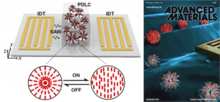 In recent years, polymer-dispersed liquid crystals (PDLCs) have been used in many applications including smart windows, displays, microlenses, lasers, and data storage, due to their excellent electro-optical properties. Within a PDLC film, liquid crystals (LCs) are generally trapped in a transparent polymer medium, thus forming micrometer-scale LC droplets. The PDLC film can be switched from opaque to transparent by acoustic tweezers. A SAW-driven PDLC light shutter has been demonstrated by integrating a cured PDLC film and a pair of interdigital transducers (IDTs) onto a piezoelectric substrate.[32] The IDTs were used to generate the SAW for driving the PDLC film. Figure 19 illustrates the layout and working principle of the SAW-driven PDLC light shutter. A PDLC cell is located in between two identical IDTs, which are deposited on a piezoelectric substrate with a parallel arrangement. One IDT is used for SAW generation and the other is used for SAW detection. A radio-frequency (RF) signal is applied to a single IDT to generate a SAW, which propagates along the surface of the piezoelectric substrate (x direction in Figure 19). By tuning the applied frequencies from the function generator and monitoring the frequency-dependent output voltage from the detection IDT that is connected to an oscilloscope, an optimal resonant frequency can be selected for the driving frequency. Under this resonance frequency, the LC molecules can be reoriented perpendicular to the substrate. Therefore, the optical properties of PDLC film can be changed with acoustic tweezers.