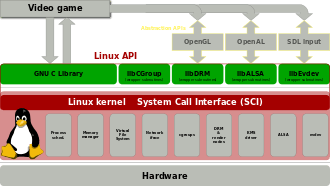 The Linux API is composed out of the System Call Interface of the Linux kernel, the GNU C Library (by GNU), libdrm, libalsa and libevdev (by freedesktop.org).