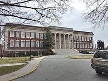 Built in 1930, and considered the architectural centerpiece of the district, the neoclassical building is named for the university's second president Dr. James B. Dudley.[14] The Dudley Building was designed by noted North Carolina architect Charles C. Hartmann, this building was erected on the site of the former Administrative building, which was built in 1893 and destroyed by fire in 1930.[15] The building originally housed the college's administrative offices, in addition to an auditorium and library on the main and top levels respectively.[8] Today the Dudley building houses the University art galleries on the main floor.[16] The 29,058 square foot building features 2 floors in addition to a fully raised basement level. A distinctive feature of this building is its use of stone. This building features more stone application than any other building on the university's campus. The building also features a broad sweep of fifteen steeps to the main entrance, smooth-face blocks defining a five-bay entrance, intricately carved lintels and acroteria, full classical entablature, splayed arches with keystones over the eight-over-twelve sash windows, and a hexastyle portico with an incised frieze.[8] The building's interior remains unaltered as the original plaster walls and molded door and window surrounds still remain. The exterior of the building has been virtually unchanged with the exception of the entrance doors, which are now made of double-leaf metal trimmed plate glass.