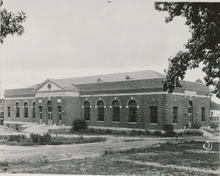 Built in 1939, and named for renowned actor Richard B. Harrison, who taught Drama and directed productions at the college; Harrison Auditorium was designed by architect Leon McMinn.[17] The auditorium was constructed by the Public Works Administration for usage as the college's main auditorium. The flat-roofed two story building features seven-bay main entrance with the bays defined by plain brick pilasters with simply molded stone bases and capitals. Extending above the pilasters is a plain stone frieze inscribed with the auditorium's name. Five pairs of glass and wood doors topped by five-light transoms give access to the lobby. Above each entry door at the second story level are large twelve-over-twelve sash windows. The roof line steps up at the rear of the lobby/entrance portion of the building to provide additional height to the main, large auditorium portion of the building.[8] In 2004, the building underwent a two-year renovation process that involved both the interior and exterior of the building.[18] The nearly $3 million renovation repaired the building's exterior surfaces, upgraded building systems, replaced seating, and made the building compliant with the Americans with Disabilities Act.[19]