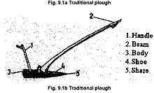 Almost all farming tools in Ethiopia are traditional and made of from different wood materials.[22] These tools includes sickle, pick axe,plough shaft, ploughshare, plow, beam and animal force as a machines. The plough shaft, beam and ploughshare are made of wood and the sickle, pick axe, plow are made of metal. ploughing the land using these tools is ambiguous and time consuming.