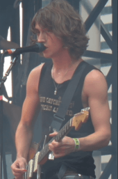 Turner and Matt Helders became friends at the age of seven;[20][21][22] they were neighbours and attended the same primary school.[23][24] They performed Oasis's "Morning Glory" together in their final primary school assembly.[25] They met Andy Nicholson at secondary school[26] and, for most of their teenage years, the three friends listened to rap artists such as Dr. Dre, Wu-Tang Clan, Outkast, Cypress Hill and Roots Manuva.[11][27][28] They spent their weekends "making crap hip-hop" beats using Turner's father's Cubase system.[10][29] Following the breakthrough of The Strokes,[12] Turner was drawn to guitar bands including The Hives and The White Stripes.[9] Jamie Cook, a neighbour, introduced him to Queens of the Stone Age and The Coral[27] and he first listened to The Libertines on Nick O'Malley's Walkman during a bus ride from High Green to Barnsley College.[30][31][32] Turner attended his first gig in 2002, watching The Vines in Manchester.[33] In 2003, at the age of sixteen, he travelled to London with Helders and Nicholson to watch The Strokes play at Alexandra Palace; they met Pete Doherty in the audience.[29][34]
