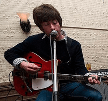 Turner's parents bought him a guitar for Christmas 2001.[35][36] In mid-2002, Turner, Cook, Nicholson and Helders decided to form a band, having watched friends including Milburn play at local pubs.[37] The name Arctic Monkeys was conceived by Cook. Turner initially did not want to be the singer; a number of schoolmates including Glyn Jones tried out before he became the frontman.[36][37][38] All four were beginners on their instruments; they practised in both Turner and Helders' garages and, later, at an unused warehouse in Wath. According to Helders' mother, who drove the teenagers to and from their rehearsal space three times a week: "If they knew you were there, they would just stop so we had to sneak in ... Half the time, though, they were playing table tennis."[39][40] At first, the band's original songs featured nonsense words[37][41] but Turner eventually began to share his own lyrics with his bandmates: "I had this sense of dread that the others would laugh me out of the room. Mickey-taking is a useful quality control."[38] They practised for a year before playing a live show: "A lot of people have an idea of the music they wanna make and then they go make it, but we started the band to have something to do and then figured all that stuff out."[42] "I’m quite easily influenced. I could have ended up anywhere with a little push from whoever. So it was important that it was us four.”[43] Their first gig was on Friday, 13 June 2003, supporting The Sound at a local pub called The Grapes. Their eight-song set comprised three covers and five self-composed songs.[44]