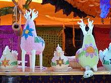 Alfeñique are folk art objects made from a sugar paste, originating in Italy where figurines were made from sugar for religious decorations. They became popular in Spain, wherefrom they were eventually brought to Mexico with Catholicism, where they became a part of Day of the Dead celebrations, starting around the 17th or 18th century.[1] Alfeñique, whose name is from Arabic was used to replace the Aztec tradition of making figurines of amaranth for altars. The Spanish conquistadors brought sugar cane, which became the main ingredient in the making of these figurines which continues to this day.[2] During the colonial period, figures of sheep made with this were popular.[3]