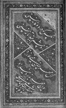 Alireza Abbassi Tabrizi was a prominent Iranian calligrapher and calligraphy teacher. He was titled by Abbas I as Šāhnavāz Xān. Abbassi was a master of Naskh and Thuluth scripts and the initiator of his own style of Nastaʿlīq script. Besides he was an expert of various other scripts like Muhaqqaq, Reqa, Reyhan, Tevki and Taʿlīq scripts.[1]