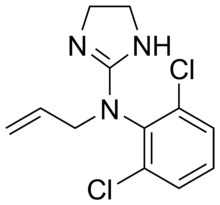 Alinidine (ST567) is a negative chronotrope that was developed in the 1970s and 1980s. It causes bradycardia by inhibiting the pacemaker current by altering the maximal channel conductance and alter the voltage threshold.[1] The development of alinidine was halted because it was not sufficiently specific for its target. It also has a blocking effect on calcium channels and potassium channels. It also causes elongation of re-polarisation after an action potential.[2]