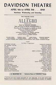 Hammerstein had thought of writing a play about a man, from birth to death. However, having just killed his leading male character, Billy Bigelow, onstage in Carousel, he was reluctant to kill off another.[2] In the end, he took his protagonist from birth to age 35.[1] He envisioned a simply staged work like Our Town which after its initial run would lend itself to college productions.[3] Allegro was conceived as taking place in an open space, using props and projections to convey scenery to the audience.[4] In addition to the customary singing chorus, there would be a speaking chorus, in the manner of a Greek chorus, which would comment on the action, and speak to both characters and audience.[4]