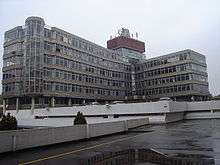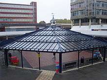 Pedestrian shop-lined walkways lead onto Anglia square which was originally open to the elements but now covered by a steel and glass structure - added in the late 20th century. The red brick and concrete buildings are finished in the brutalist style. Forming the western boundary of the centre is the former HMSO building Sovereign House the building, now empty and due for demolition.[2][3] Built on a concrete raft and rising above the centre is the c.1971 former Odeon cinema, now part of the Hollywood chain, which replaced a nearby 2,000 seat pre-war cinema.[4]