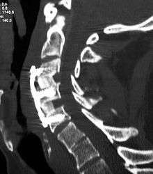 To prevent the vertebrae from collapsing and to increase stability, the open space is often filled with bone graft, taken from the pelvis or cadaveric bone. The slow process of the bone graft joining the vertebrae together is called "fusion". Sometimes a titanium plate is screwed on the vertebrae or screws are used between the vertebrae to increase stability during fusion, especially when there is more than one disc involved.