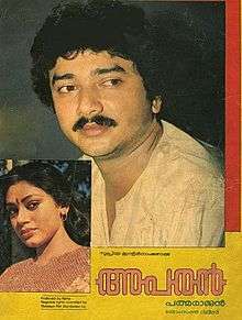 Aparan (English: The Impostor) is a 1988 Malayalam mystery film written and directed by P. Padmarajan, starring Jayaram, Mukesh, Shobana, Parvathy and Madhu. Loosely based on the short story Aparan by Padmarajan, the film is about mistaken identity and the problems that a young, innocent man has to undergo in his life.