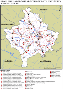 The Late Antique Period, respectively known also as the Early Byzantine Period, in Kosovo marks the time frame from the rule of the Emperor Constantine the Great (306-337 AD), respectively during the 4th, 5th and 6th century AD; a time period which was perceived by historians to describe the transitory phase from antiquity to medieval. One of the most distinguished features of the Late Antiquity was the centralization of power into the emperors hands, division of the military from civil administration, but on top of that, this period is related with the crises in ancient production system and with a decline of the Roman Empire. In regard to this period that is between innovations and tradition, the present day territory of Kosovo, goes through some changes, transformations and developments in economical, social, cultural, religious and political-administrative aspect, which made an impact on future evolution of this area. Furthermore, the novelty of this epoch was the consolidation of the Christianity and the bloom of the Serbian Orthodox art and architecture, a characteristic for combination of tradition and innovation. Therefore, the construction architecture of this time is known by archaeologists, architects and art historians as the early Christian period architecture. On the other hand, the ancient written sources, archived church written sources, but even the oral histories in the form of myths, legends or local toponomy of the archaeological site locations, stored in the collective memory of people from different parts of the Kosovo, have offered and will provide very important data that is used in synthesised form to provide a general overview of either common or individual extraordinary rich archaeological heritage, not only for the region but even wider, including the southeast Europe. Yet, Kosovo should not be treated anymore as Terra Incognita, but contrariwise, based on the archaeological documentation, this aided by the auxiliary sciences and relevant scientific disciplines, reflect a very advanced civilization, different and even cosmopolite developments in the ancientness. The written sources, besides tangible ones, complement the facts on the occupation and continuative presence of the autochthonous population, which was evidenced with the creation of the Dardanian Kingdom, 4th-1st century BC and later with the constitution of the Roman Province of Dardania in 297 AD; established by the Emperor Diocletian . The Late Antique period and the Early Medieval period, where a periods with an argued presence of a large number of toponomies like for example; gradishte (fortes), gradina (stronghold), kala (castle), (tower), (fortification), etc. Furthermore, these toponomies specifically indicate the fortified settlements set on the hills and fortified with ramparts and documented across Kosovo during the systematic archaeological surveys, reconnaissance and trial trenches, carried in the past, since the second part of the last century and continued up to the present days.