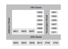 Address numbers can be determined from the numbers or names of intersecting streets. Addresses on north-south routes, including exceptions from the numbering and naming system, follow the numbers of intersecting (or implied intersections of) numbered streets. For example, 2005 South Glebe Road would lie just beyond the intersection of South Glebe Road and 20th Street South. Addresses on east-west, including exceptions from the numbering and naming system, are based on the intersecting (or implied intersections of) named streets with each letter/syllable combination representing 100 address numbers. The chart below shows the block numbers on east-west streets. Full-Lot houses often skip 4 numbers in between houses, and town homes generally skip two; while the opposite side of the street is offset by one number, so that one side can be even, and one odd.