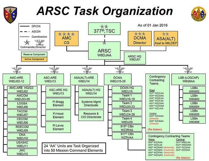 The ARSC provides trained and ready U.S. Army Reserve Soldiers in support of Army Materiel Command (AMC), Assistant Secretary of the Army (Acquisition, Logistics, and Technology) ASA(ALT), Defense Contract Management Agency (DCMA), Defense Logistics Agency (DLA), Logistics Civil Augmentation Program (LOGCAP), and Acquisition Contracting Command (ACC) worldwide mission requirements.
