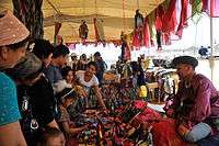 This year's highlight was an exhibition of Akhal-Teke horses, whose beauty, grace and skills had been charming people around the world for 5,000 years.[15] Scores of motley yurts, pavilions and cafes offering national culinary delights were mounted at the foot of the Tuproq Qala citadel while young lads dressed like warriors were standing as historical guards on top of the old walls of the fortress along its perimeter.[16]