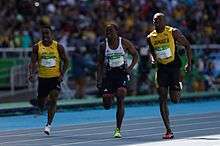 - ↑ "Usain Bolt wins third straight 100m Olympic final – as it happened". Guardian. 15 August 2016. Retrieved 16 August 2016.