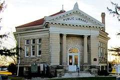 The Atlantic Public Library, located at the intersection of Race and Arch Streets, is Atlanta, Illinois' public library. The library was built in 1908 and has operated continuously since then. Architect Paul A. Moratz's design for the building combines the Neoclassical with an octagonal plan, an uncommon mixture of styles. The building's eight sides are all symmetrical except for the front, which is broken by a classical portico with Doric columns and a round arched entrance. The library is topped by a red tile roof.[2]