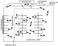 The milking unit comprises a milking machine, a teat position sensor (usually a laser), a robotic arm for automatic teat-cup application and removal, and a gate system for controlling cow traffic. The cows may be permanently housed in a barn, and spend most of their time resting or feeding in the free-stall area. If cows are to be grazed as well, a selection gate is required to allow only those cows that have been milked to the outside pastures.