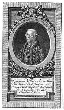 The printing of the Avramović Dictionary began at the end of 1789.[14] In February 1790, Kurzbeck requested and received Metropolitan Putnik's permission to dedicate the book to him.[16] After the metropolitan died on 9 July 1790, Kurzbeck stopped its printing. Emanuilo Janković, whose petition to found a Serbian printing house in Novi Sad was rejected, criticised the dictionary and Kurzbeck's Cyrillic production in general; he owned a press in Leipzig. The new Metropolitan of Karlovci, Stefan Stratimirović, was elected in November 1790, and he approved the dictionary at Kurzbeck's request. Its printing was then resumed and completed in the first half of May 1791. Kurzbeck sent a copy to Count Francis Balassa, the head of the Illyrian Court Chancellery,[14] which was a Habsburg ministry focused primarily on the Serbs.[13] Kurzbeck requested and received Balassa's permission to include a dedication to him and his portrait in the dictionary.[14] The book appeared at the end of July 1791; its price was 7 guldens and 30 kreuzers.[19]