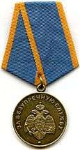 Awarded to the most distinguished members of the staff of the Ministry of Emergency Situations of Russia, and in some cases, to other citizens for courage and dedication in conditions involving the risk of life, for skilful and decisive actions and initiative contributing to the successful implementation of measures to eliminate the consequences of emergencies, save lives and protect property; for the successful management of the actions of subordinates in carrying out tasks in the aftermath of an emergency. A 3,000 rouble monetary reward accompanies the medal.[2][5][3][4] |