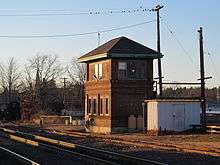 Ayer is a regional rail station on the MBTA Commuter Rail Fitchburg Line, located off Main Street (Route 2A/111) in the Ayer Main Street Historic District in downtown Ayer, Massachusetts.[3] There are three tracks through the station, two of which are served by a pair of low-level side platforms, which are not handicapped-accessible. There is a shelter on the inbound platform.
