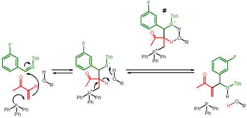 In one study a reaction mechanism for a specific aza-BH reaction is proposed.[2] Given a set of reaction conditions the reaction is found to be first-order in the triphenylphosphine nucleophile, MVK and the tosylimine concentration in the rate determining step in the presence of a Brønsted acid such as phenol or benzoic acid. The presence of an acid facilitates the elimination reaction in the zwitterion by proton transfer which becomes much faster and no longer rate determining. A 6 membered cyclic transition state is proposed for this reaction step. Because this step is also reversible the presence of acid causes a racemisation process simply by mixing chiral aza-BH adduct, phosphine and acid.