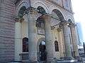 The church is rectangular in plan and made of valuable stone blocks alternating with rows of brick. To the east, north and south, there are small semicircular apses beneath the top of the walls, flanked by pilasters that rest on bases. The wide central dome, with Neo-Gothic and Romanesque elements, sits above a square base, and is surrounded by four much smaller domes with octagonal bases.[1] The main entrance features an imposing portal held up by eight Doric columns.[5] Above this is a classical facade that also features Doric columns.[2]