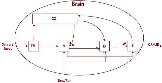 O, the orbitofrontal cortex, operates based on the difference between the perceived (i.e. expected) reward/punishment and the actual received reward/punishment. This perceived reward/punishment is the one that has been developed in the brain over time using learning mechanisms and it reaches the orbitofrontal cortex via the sensory cortex and the amygdala. The received reward/punishment on the other hand, comes courtesy of the outside world and is the actual reward/punishment that the specie has just obtained. If these two are identical, the output is the same as always through E. If not, the orbitofronal cortex inhibits and restrains emotional response to make way for further learning. So the path W is only activated in such conditions.