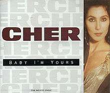 Cher remade "Baby I'm Yours" for the soundtrack of her 1990 film vehicle Mermaids. Cher's version was arranged to replicate Barbara Lewis' hit, and was produced by Peter Asher, who as a member of Peter and Gordon had had the UK hit of "Baby I'm Yours". The song was not featured in the film but was selected as the lead single from the soundtrack for release in the UK and Europe after the US single release "The Shoop Shoop Song" — which as remade by Cher had played under the film's closing credits — fell short of the Billboard Top Thirty. "Baby I'm Yours" failed as a single; its only apparent charting was in the UK at #89 and its estimated global sales tally is 100,000 units[13] "The Shoop Shoop Song" was released in the spring of 1991 with "Baby I'm Yours" as the B-side, and spent five weeks at #1 in the UK and achieved Top Ten status in several European countries as well as Australia and New Zealand. (Coincidentally the precedent charting single to the Linda Lewis 1976 UK hit remake of "Baby I'm Yours" had been the first major UK hit version of "The Shoop Shoop Song", entitled "It's in His Kiss".)