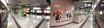 Bao'an Stadium Station (simplified Chinese: 宝体站; traditional Chinese: 寶體站; pinyin: Bāotǐ Zhàn; Jyutping: Bou2 Tai2 Zaam6) is a station on the Luobao Line of the Shenzhen Metro in Shenzhen, Guangdong Province, China. The station opened on June 15, 2011. The Chinese name 宝体 is short for 宝安体育馆 (Bao'an Stadium,Chinese: 寶安體育館; Jyutping: Bou2 On1 Tai2 Juk6 Gun2). The station serves the nearby Bao'an Stadium.