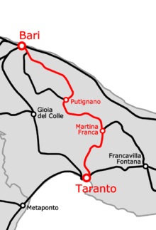 The Bari–Martina Franca–Taranto railway is an Italian 113-kilometre long railway line, that connects Bari with Putignano, Martina Franca and further to Taranto.