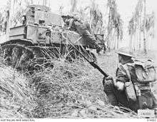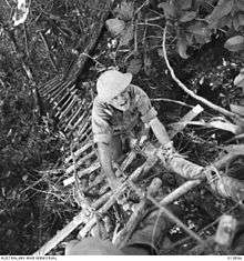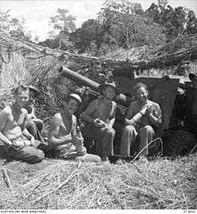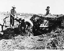 The task of destroying Japanese bunkers was found to be "beyond the scope of 25 prs".[198] Brigadier General Waldron, the 32nd Division's artillery commander at the start of the battle, was more forthright. "The 25 pounders", he said, "annoyed the Japanese, and that's about all."[199] The gun's flat trajectory and small explosive shell was not suited to destroying emplacements, but rather for fire support against exposed targets.[200][Note 20] The high trajectory of the mountain howitzers was better suited to this task but, while a larger calibre, they fired a smaller 20 pound shell. The 3.7 in howitzer was considered accurate and capable of a high rate of fire; however, these particular guns were well worn, and accuracy was compromised as a consequence.[185] Shells used by artillery were armed with instantaneous fuses, causing them to explode on impact. Hits achieved by the artillery were comparatively ineffective.[200] With adequate observation, between 100 and 200 shells fired by four guns were needed to reduce a large emplacement.[198] A delayed fuse, to postpone the explosion until the projectile had buried itself deep in the target, would have been much more effective. None were initially available, and when they were, their supply was limited.[201] The Japanese defenders referred to delayed-fuse shells fired from the American 105 mm howitzer as "earthquake bombs".[202] The Japanese defensive positions remained substantially proof against shell fire.[203] The use of delayed fuses at Gona on 8 December was critical to the success of the 39th Battalion, when attacking troops spent two full minutes under their own artillery bombardment as they stormed Japanese positions.[204]