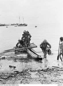 The alternative of resupply by sea was equally problematic. Before the war, coastal traders approached the north coast of New Guinea from Rabaul, on the island of New Britain.[105] This route was denied by the Japanese occupation of the island. The coastal passage from Milne Bay was treacherous and lacked an identified safe sea route.[106] An assortment of small vessels were operated by the Small Ships Section of the US Army Services of Supply (USASOS). The vessels were "schooners, motorships, motor launches, cabin cruisers, ketches, trawlers, barges, and miscellaneous vessels, most of which were ancient and rusty."[107] They were leased or requisitioned by the US Army and largely crewed by Australians under contract with USASOS.[108] Initially, these vessels faced a constant threat of attack by Japanese planes.[109] This situation eased as the Allies began to achieve air dominance near the end of 1942.[110] The Small Ships Section was operating vessels up to 500 tons but most were significantly smaller than this.[111]