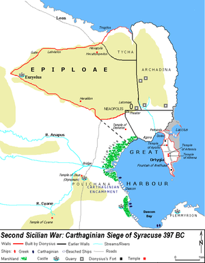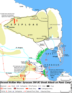 Himilco led the Carthaginian army (50,000 men, 400 triremes, and 600 transports) to Sicily in 397 BC.[7] When the Carthaginians reached Syracuse, their war fleet had shrunk to 208 ships, though 2,000 transports had been employed to carry supplies to the army.[8] The number of soldiers in Syracuse is unknown, as some garrisoned the Carthaginian possessions, and the Carthaginians had been reinforced by Sicels, Sikans and Elymians after arriving in Sicily.