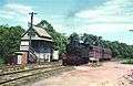 The station here consisted of a long platform on the right-hand side, with low buildings and offices. There was a run-round loop, a long goods siding and two additional sidings serving a colliery loading bank. The points at the approach end of the loop were unlocked by a key from the lever frame which worked all the other points.