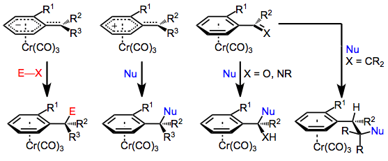 The reaction between tricarbonylchromium complexes Cr(CO)3L3 and electron-rich or electron-neutral aromatic rings produces tricarbonyl(arene)chromium complexes (arene)Cr(CO)3.[2] Complexation to chromium(0) activates the side chain of the arene, facilitating dissociation of a benzylic proton or leaving group or nucleophilic addition to the homobenzylic position of styrenes. Further transformations of the resulting conformationally restricted, benzylic anion or cation involve the approach of reagents exo to the chromium fragment. Thus, benzylic functionalization reactions of planar chiral chromium arene complexes are highly diastereoselective. Additionally, the chromium tri(carbonyl) fragment can be used as a blocking element in addition reactions to ortho-substituted aromatic aldehydes and alkenes. An ortho substituent is necessary in these reactions to restrict conformations available to the aldehyde or alkene.[3] Removal of the chromium fragment to afford the metal-free functionalized aromatic compound is possible photolytically[4] or with an oxidant.[5]