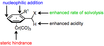 The majority of benzylic functionalization reactions of tricarbonyl(arene)chromium complexes proceed by mechanisms analogous to those followed by the free arenes. There are three important differences, however. First, the aromatic ring and benzylic position are activated towards solvolysis, deprotonation, and nucleophilic attack (at the ortho and para positions of the arene) upon complexation to chromium, which is able to stabilize developing charges in the arene ligand. As a result, these reactions of chromium arene complexes are often faster than analogous reactions of free arenes.[6]