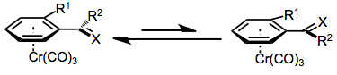 Second, in benzylic cations and anions of chromium arene complexes, rotation about the bond connecting the benzylic carbon and aromatic ring is severely restricted. This bond possesses a significant amount of double bond character due to the delocalization of charge into the aromatic ring (and the stabilization of that charge by chromium).[7]