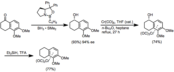Enantiopure, planar chiral chromium arene complexes can be synthesized using several strategies. Diastereoselective complexation of a chiral, non-racemic arene to chromium is one such strategy. In the example in equation (5), enantioselective Corey-Itsuno reduction[9] sets up a diastereoselective ligand substitution reaction. After complexation, the alcohol is reduced with triethylsilane.[10]