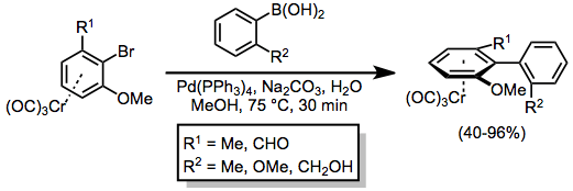 Complexation of a haloarene to chromium increases its propensity to undergo oxidative addition.[23] Suzuki cross coupling of a planar chiral chromium haloarene complex with an aryl boronic acid is thus a viable method for the synthesis of axially chiral biaryls. In the example below, the syn isomer is formed in preference to the anti isomer; when R2 is the formyl group, the selectivity reverses.[24]