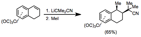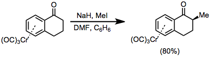 Tetralones complexed to chromium may be deprotonated without side reactions. Alkylation of the resulting enolate proceeds with complete diastereoselectivity to afford the exo product.[25]
