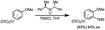 A second strategy involves enantioselective ortho-lithiation and in situ quenching with an electrophile. Isolation of the lithium arene and subsequent treatment with TMSCl led to lower enantioselectivities.[11]