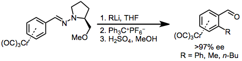 Site-selective conjugate addition to chiral aryl hydrazone complexes can also be used for the enantioselective formation of planar chiral chromium arenes. Hydride abstraction neutralizes the addition product, and treatment with acid cleaves the hydrazone.[12]