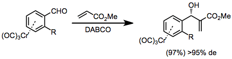 ortho-Substituted aryl aldehyde complexes undergo diastereoselective nucleophilic addition with organometallic reagents[13] and other nucleophiles. Equation (8) is an example of a diastereoselective Morita-Baylis-Hillman reaction.[14]